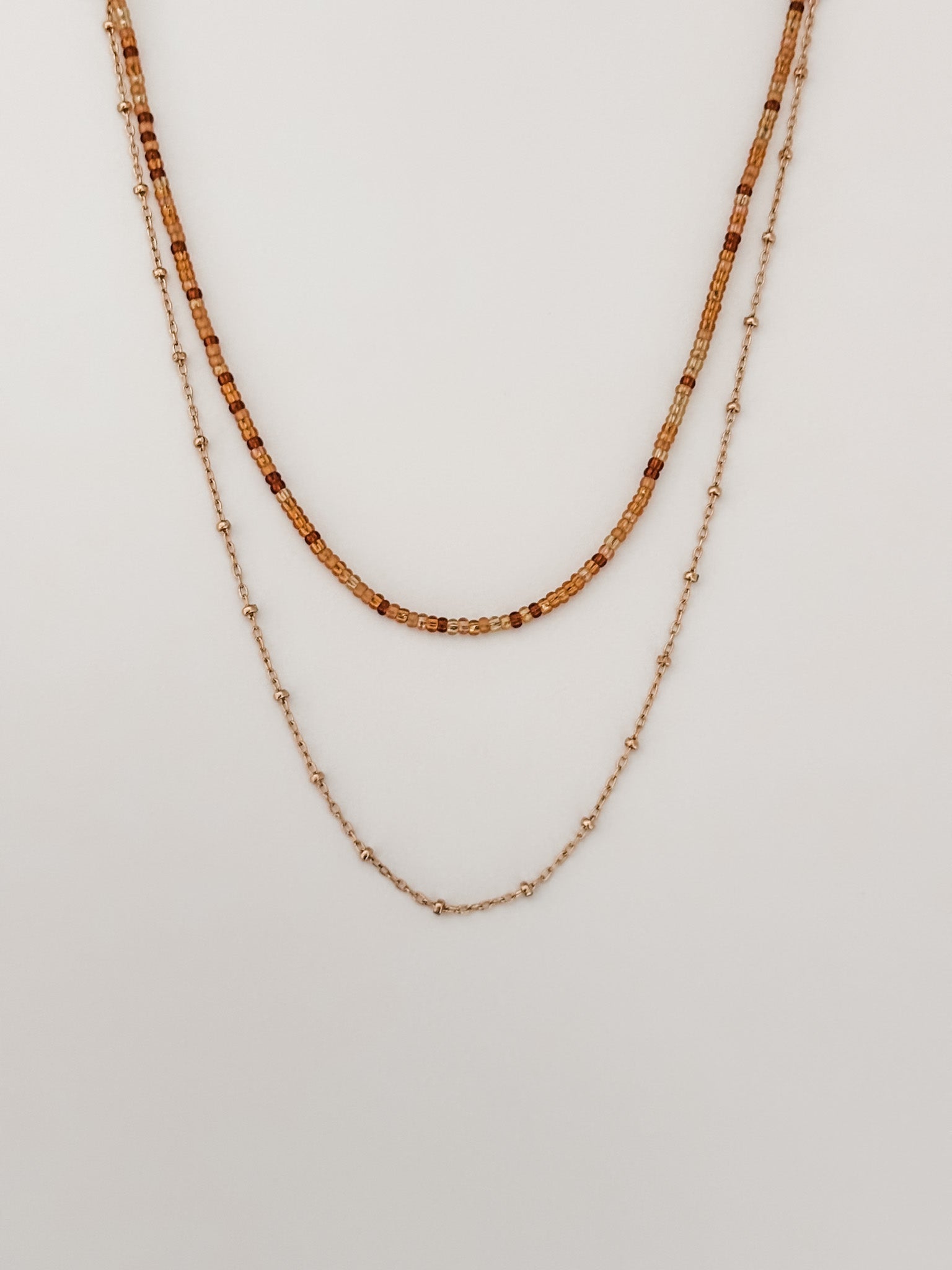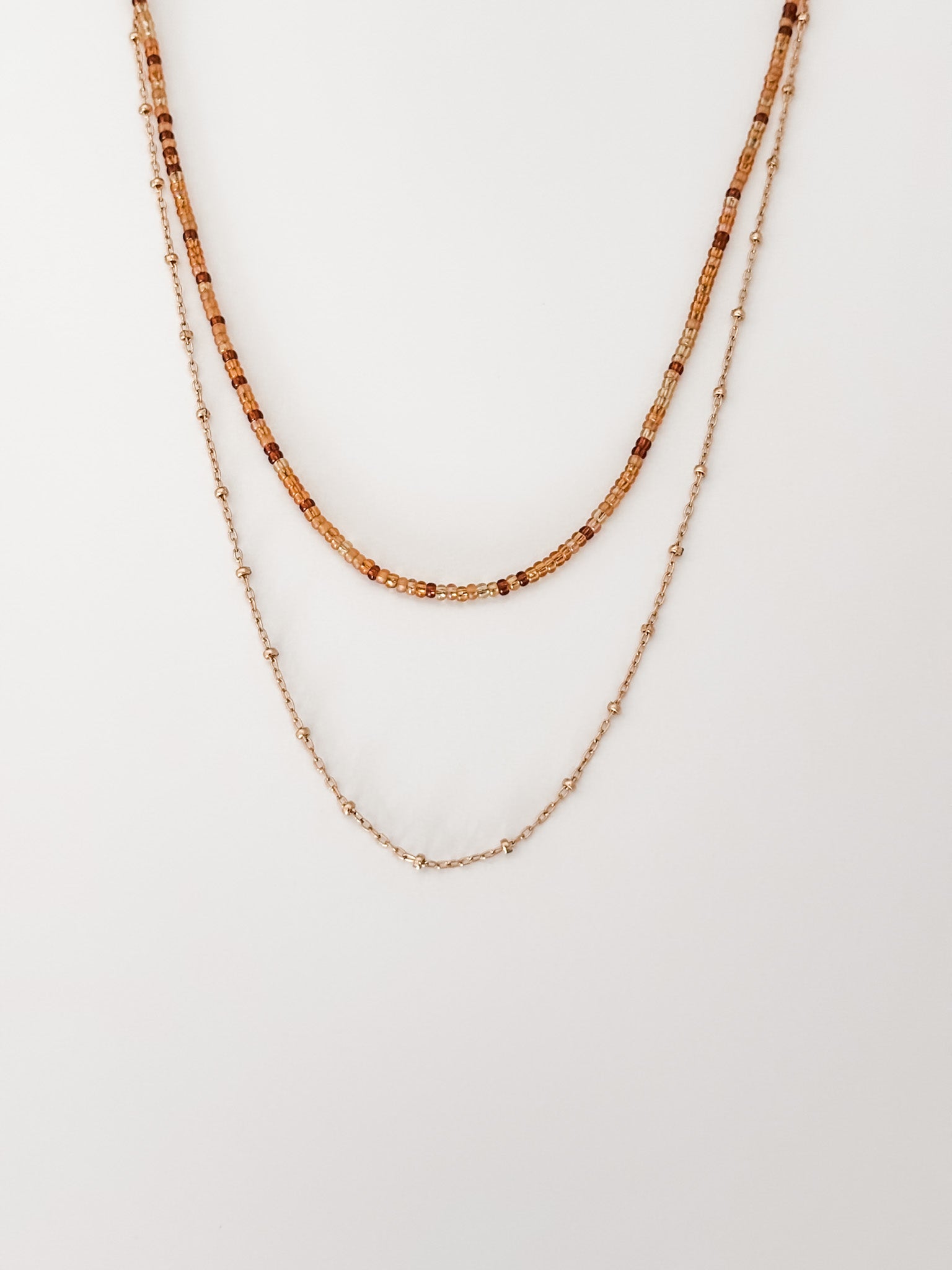 Add fun color to your style with this handmade layered necklace! It mixes warm amber seed beads with a shiny gold chain, making it perfect for wearing with your favorite fit. Each necklace is one of a kind